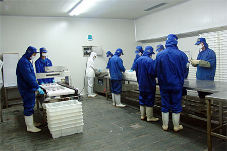 本公司是一家以水產(chǎn)品加工為主的出口型企業(yè),于2004年9月建成并正式投產(chǎn)。公司廠房完全按照歐洲聯(lián)盟的標(biāo)準(zhǔn)設(shè)計施工,目前占地14000平方米,建筑面積8000平方米,其中加工車間1600平方米。公司日速凍能力達100噸,儲藏庫容量為5000噸,主要加工蟹類、貝類、頭足類及魚蝦類水產(chǎn)品,產(chǎn)品銷往日本、東南亞及歐盟地區(qū)。